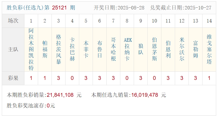 本期足彩销量21,841,108元,本期任选九销量16,019,478元,开奖结束后,足彩奖池滚存0元。