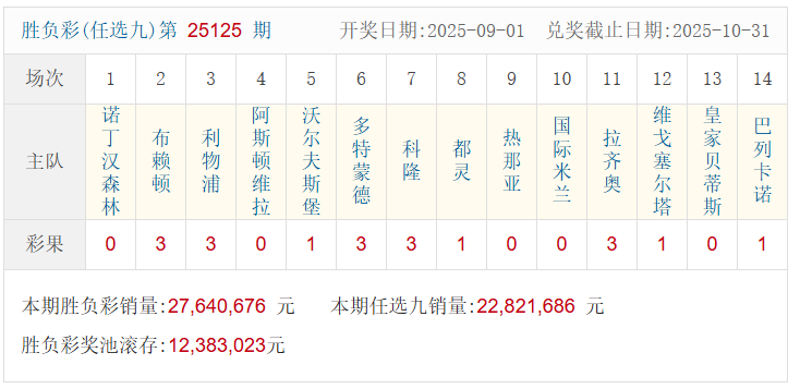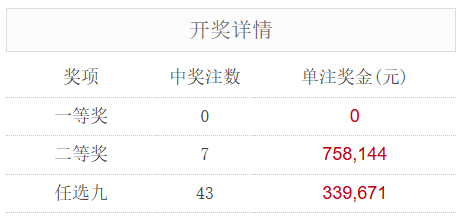北京时间9月1日,足彩25125期开奖。本期一等奖无人中出,二等奖中出7注,每注奖金758,144元。另外,任选9场中出43注,每注奖金339,671元。