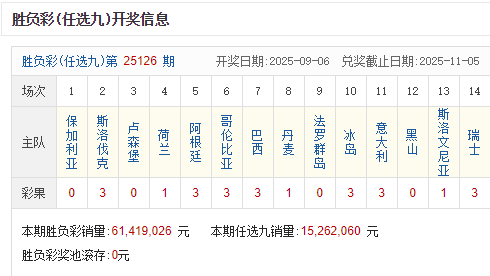 本期足彩销量61,419,026元,本期任选九销量15,262,060元,开奖结束后,足彩奖池滚存0元。
