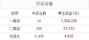 北京时间9月10日,足彩25128期开奖。本期一等奖中出10注,每注奖金1,289,226元;二等奖中出259注,每注奖金21,333元。另外,任选9场中出2439注,每注奖金4,632元。