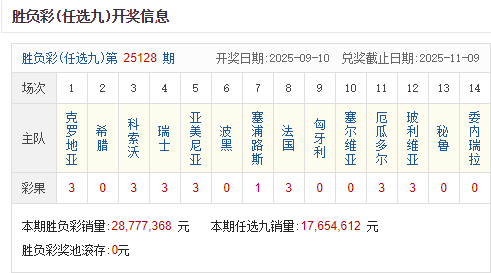 足彩25128期开奖结果:一等奖10注 单注奖金128万元