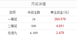 北京时间9月20日,足彩25134期开奖。本期全国中出一等奖24注,每注奖金264,579元,二等奖中出585注,每注奖金4,651元。另外,任选9场中出4689注,每注奖金2,479元。