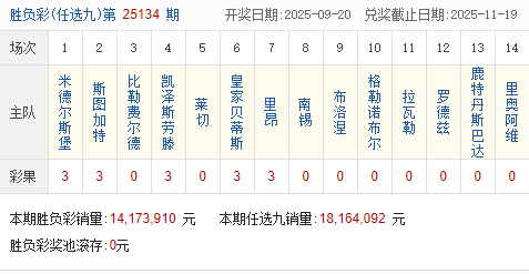 足彩25134期开奖结果:一等奖24注 单注奖金26.4万元