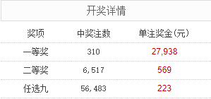 足彩25148期开奖结果:一等奖310注 单注奖金2.79万元