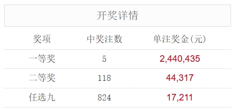 北京时间10月26日,足彩25152期开奖。本期全国中出一等奖5注,每注奖金2,440,435元,二等奖中出118注,每注奖金44,317元。另外,任选9场中出824注,每注奖金17,211元。