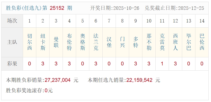 本期足彩销量27,237,004元,本期任选九销量22,159,542元,开奖结束后,足彩奖池滚存0元。