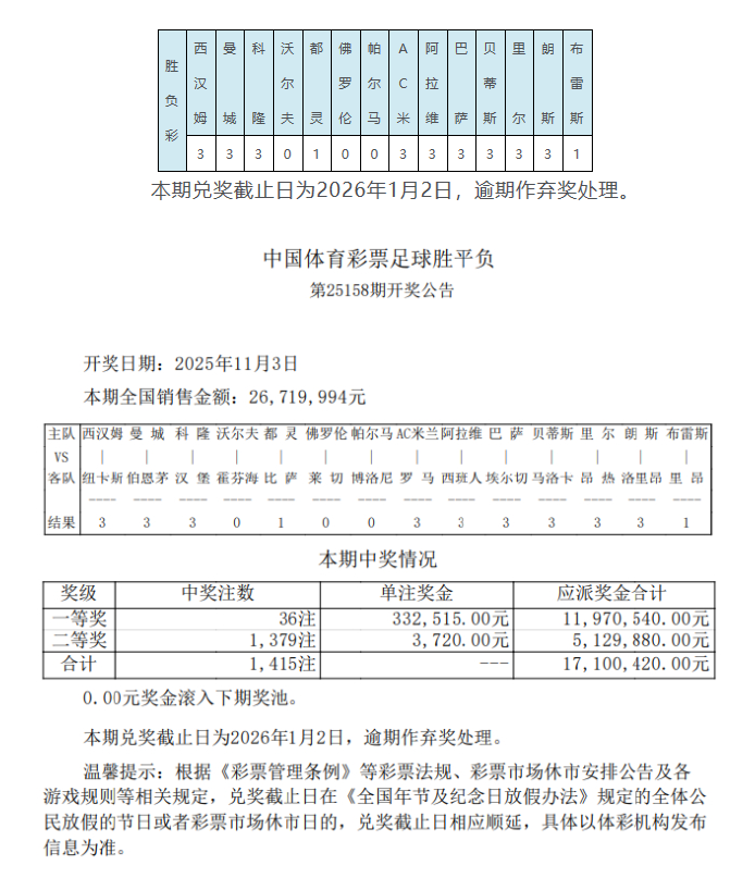 北京时间11月3日,胜负彩第25158期开奖结果揭晓。本期足彩头奖开出36注,单注奖金332,515元;二等奖开出1379注3720元;任九开9371注1498元。本期胜负彩销量为26,719,994元,任九投注总额为21,936,530元。