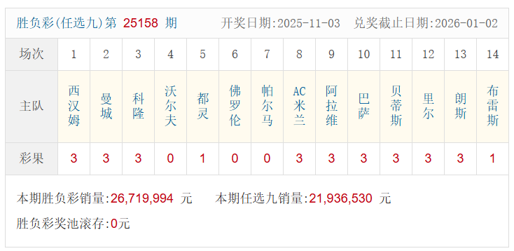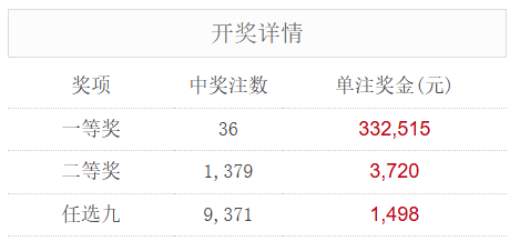 足彩25158期开奖结果:一等奖36注 单注奖金33万元