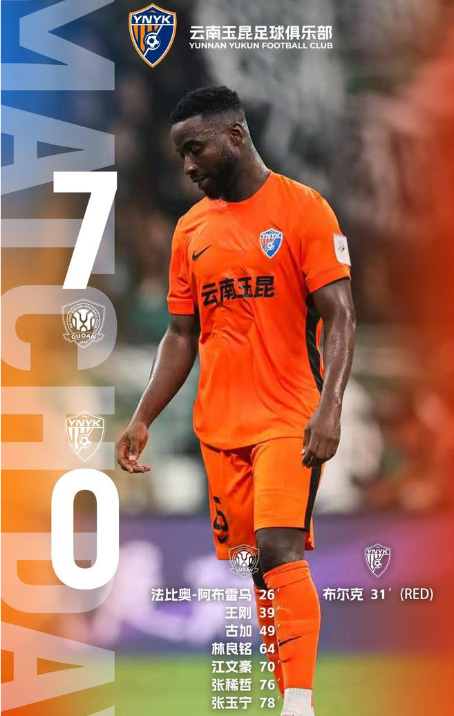 云南玉昆官方写道:“2025中国足协杯半决赛,客场作战的云南玉昆最终以0比7不敌对手。上半场第31分钟,布尔克被红牌罚下彻底改变了比赛的走势。很遗憾,我们没能在今天继续改写云南足球的历史,止步足协杯决赛门外,向所有支持云南玉昆的球迷朋友们说一声抱歉。​​​”