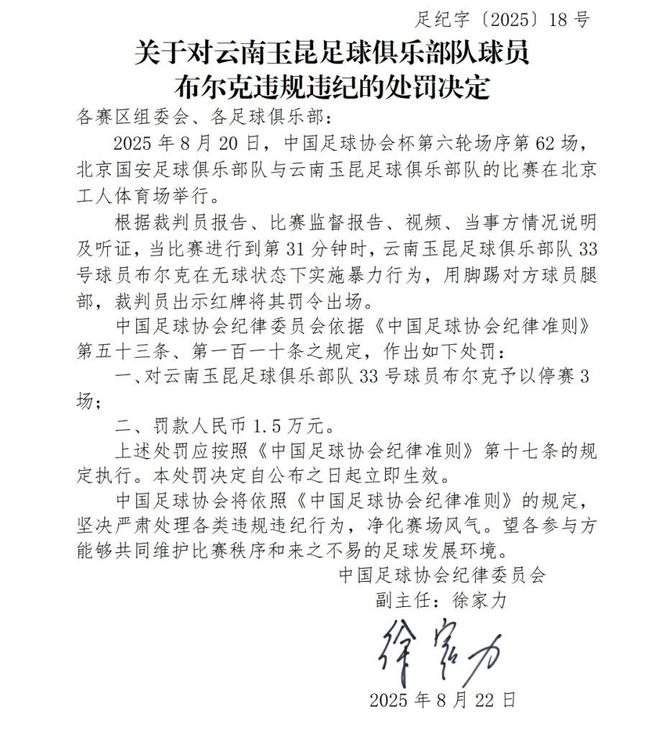 在此前结束的足协杯半决赛北京国安主场对阵云南玉昆的比赛第31分钟,布尔克在无球状态下恶意踢倒了国安外援法比奥。当值主裁判刘威第一时间向布尔克出示红牌,在VAR介入后,刘威维持原判。