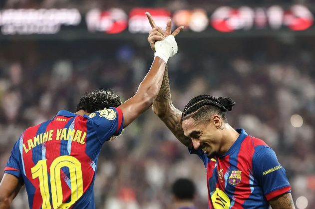 西班牙超级杯决赛展开争夺,巴萨对阵皇马。上半场,拉菲尼亚禁区首开纪录,维尼修斯一条龙破门,莱万多夫斯基单刀挑射破门,贡萨洛-加西亚扳平比分。下半场,维尼修斯兜射被扑出,亚马尔铲射被门将化解,拉菲尼亚再进一球,德容染红下场。最终,巴萨3-2击败皇马,夺得冠军!