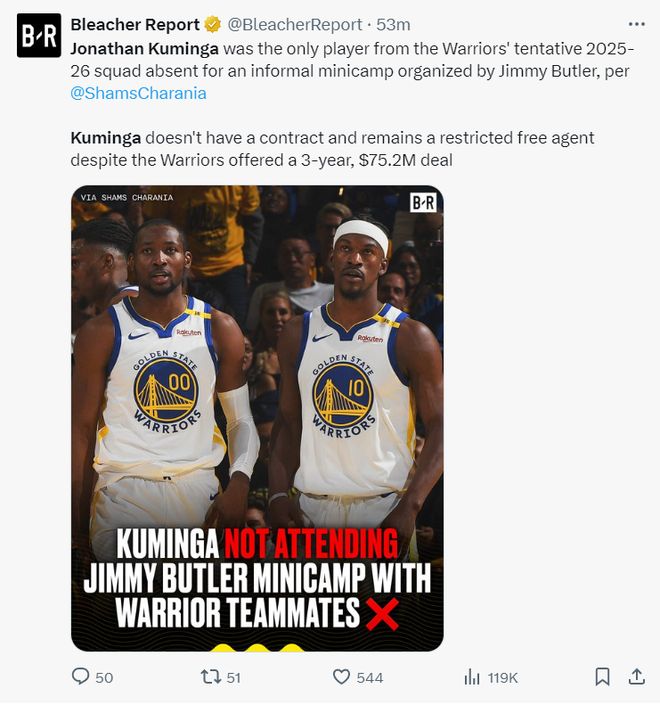 北京时间9月25日,根据ESPN的报道,勇士球员吉米-巴特勒本周在圣迭戈举办的非正式迷你训练营,乔纳森-库明加是唯一缺席的球员,据悉本次迷你训练营并不受球队管理,只要受邀的人员都可以参与。库明加目前还未与勇士签约他是受限制的自由球员,尽管勇士为他提供了三年7520万(含球队选项)的合同,但他还是没签约。