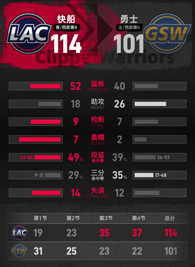 第四节,勇士开局状态不佳,快船则状态火热,迅速反超并将优势扩大至17分。尽管勇士在小节后段有所追赶,但快船的表现已不可小觑,最终凭借马瑟林的11分,全场比赛结束,快船以114-101赢得胜利。