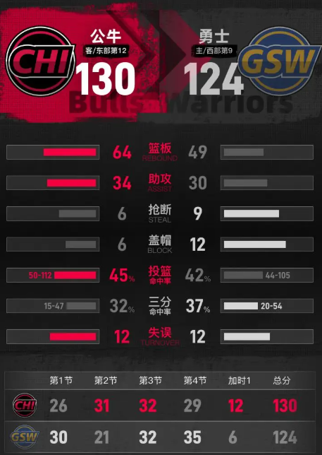 进入加时赛后,公牛先拿4分建立领先优势,格林命中三分帮勇士缩小分差,布泽利斯回应一记三分,吉迪突破上篮再拿两分,公牛把分差拉开到6分。桑托斯命中三分后,琼斯突破上篮拿分,吉迪最后时刻罚球命中,最终公牛130-124击败勇士。