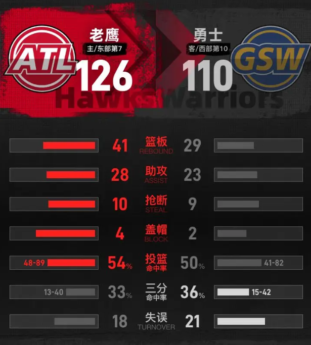 进入第四节比赛,老鹰继续保持进攻节奏,延续大比分优势,最多时领先达到28分,比赛提前失去悬念。老鹰换下全部主力后,勇士抓住机会连续得分,威廉姆斯、理查德、斯潘塞先后取分,末节尾声阶段克赖尔命中三分,莱昂斯快攻扣篮得分,最终全场比分定格为110-126,勇士客场不敌老鹰。