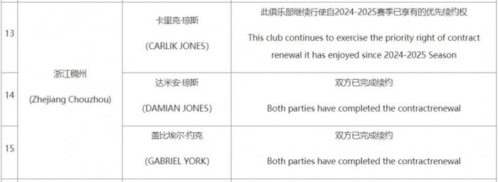 其中,浙江男篮仍然拥有卡里克-琼斯优先续约权,此外球队已经和达米安-琼斯、约克完成续约。