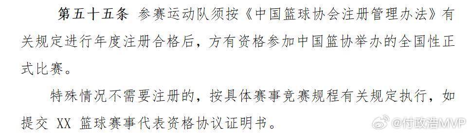 媒体人付政浩写道:“中国篮协今天公开征求《中国篮球协会赛事活动管理办法(修改稿)》的意见,其中规定“所有参赛运动队须按《中国篮球协会注册管理办法》有关规定进行年度注册合格后,方有资格参加中国篮协举办的全国性正式比赛”。当然也有特殊情况的规定:“特殊情况不需要注册的,按具体赛事竞赛规程有关规定执行,如提交 XX 篮球赛事代表资格协议证明书。”
