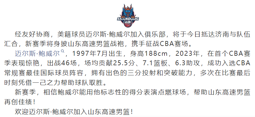 10月22日最新消息,山东高速男篮官方宣布,迈尔斯-鲍威尔正式加盟球队,并且已经顺利抵达球队,即将和球队合练开始备战新赛季的联赛。