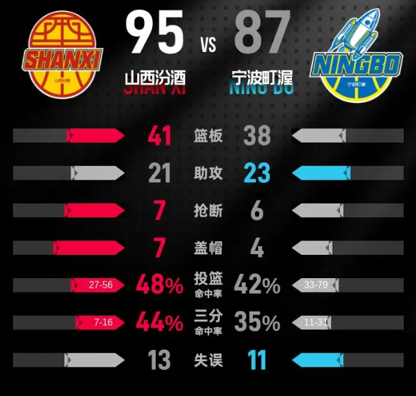 第四节,山西汾酒在比赛的最后阶段继续展现良好状态,开局迅速将优势提升至20分。然而,宁波町渥再次进行反击,一度将分差缩小至4分,给比赛带来悬念。本节中,宁波町渥的富兰克林·杰克逊表现出色,贡献了14分,其中包括3记三分。最终,山西汾酒以95-87赢下比赛,成功锁定胜局。