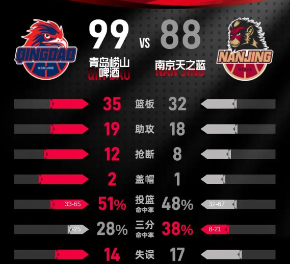 第四节,青岛崂山啤酒稳居领先地位,南京天之蓝难以找到机会缩小分差。最终,青岛崂山啤酒以99-88锁定胜局,成功赢下比赛。
