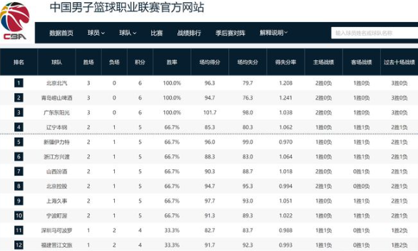 CBA第3轮积分榜:3队全胜,4队全败,广东队冲进前三名