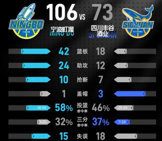 第四节,宁波町渥再次展现强劲的攻势,开局一度将优势扩大到36分。虽然四川丰谷酒业在小节后段尝试追分,但宁波町渥的优势依旧明显。与此同时,宁波町渥的罗凯文在本节中表现不俗,砍下11分,并命中了3记三分球。最终,宁波町渥以106-73赢得比赛。