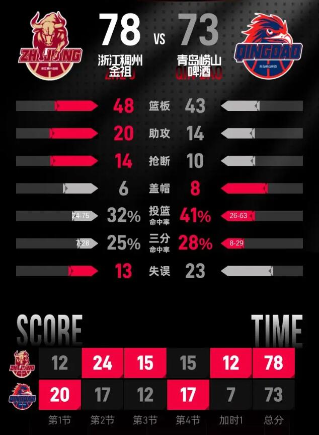 在第一个加时赛中,浙江稠州金租与青岛崂山啤酒的胶着战斗继续,双方弥漫着紧张的气氛。经过激烈的比拼,浙江稠州金租最终以78-73赢得了比赛,获得了关键胜利。
