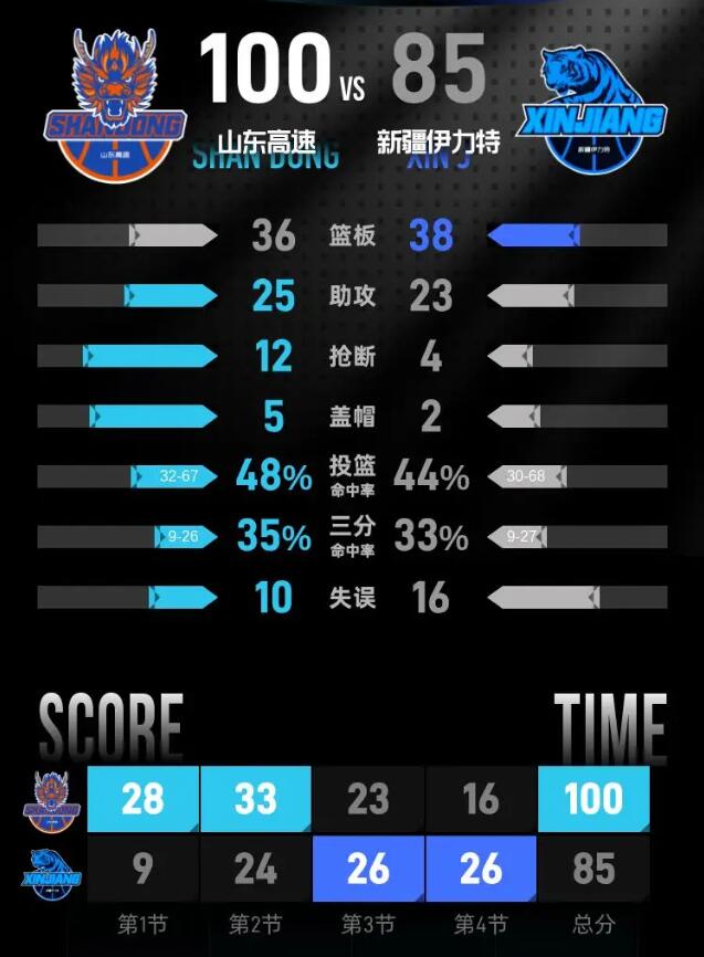 第四节,山东高速状态持续良好,开局便通过一波攻势将优势扩大至28分。此时新疆伊力特开始发动反击,逐渐将分差缩小至15分。不过在比赛的后段,山东高速依然保持着稳健的进攻节奏,进一步扩大了领先优势,最终以100-85赢得比赛。