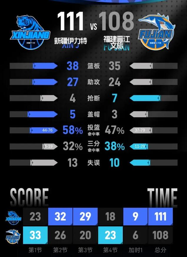 第一个加时赛中,福建晋江文旅和新疆伊力特依旧表现相当,比分交替上升,竞争丝毫不减。经过激烈的争夺,新疆伊力特在最后时刻以111-108战胜福建晋江文旅,取得胜利。