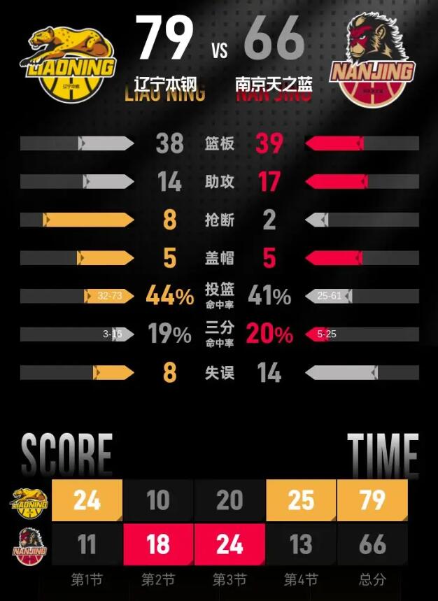 辽宁本钢队:德兹明·威尔斯24分2篮板5助攻、王岚嵚21分7篮板1助攻、付豪10分6篮板1助攻、姜宇星8分4篮板、埃里克·莫兰德8分9篮板5助攻、鄢手骐4分1篮板1助攻、杰隆·布朗2分1助攻、吴昌泽2分1篮板、张陈治锋2篮板。