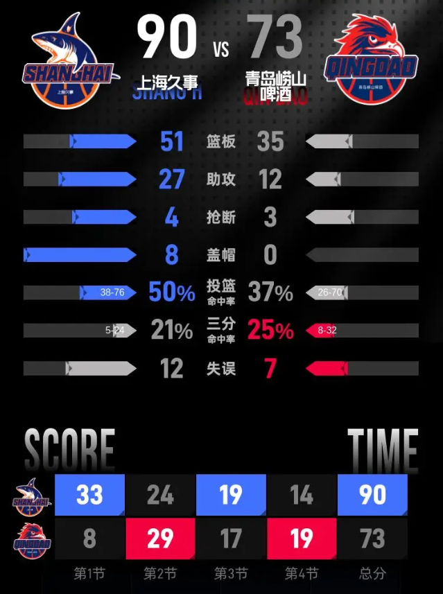 第四节,比赛进入尾声,上海久事继续保持着领先。青岛崂山啤酒毫无反击机会。此节中,约瑟夫·杨表现出色,砍下14分,包括2记三分。最终,上海久事以90-73赢得了比赛。