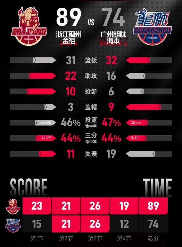 最后一节比赛开始后,浙江稠州金租手感略显疲软,分差迅速缩小至6分。随着比赛的深入,浙江稠州金租逐渐找回状态,凭借一波精彩的进攻将领先优势扩大到15分。在比赛的最后时刻,广州朗肽海本再度发起反扑,但未能扭转局势。最终,浙江稠州金租以89-74赢得比赛。