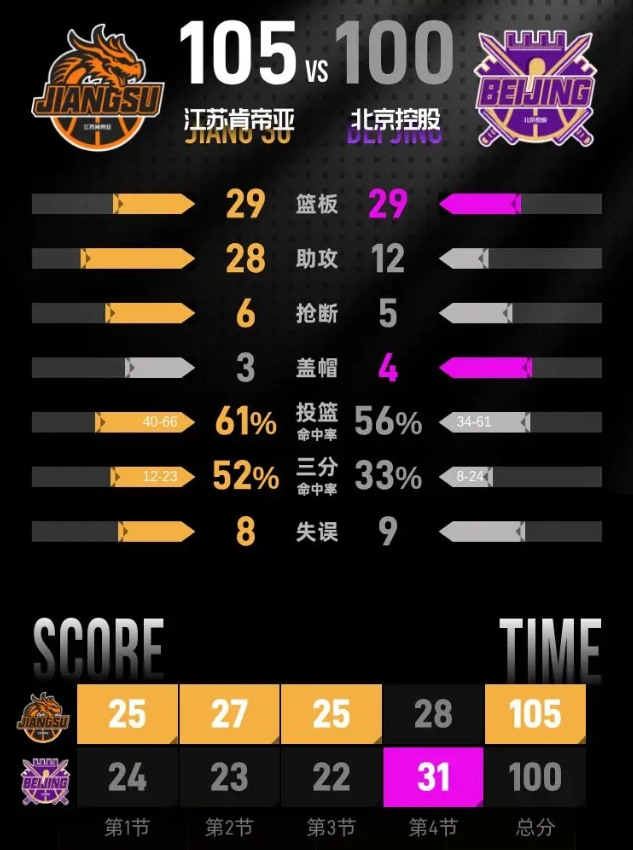 第四节,北京控股与江苏肯帝亚的对抗愈加白热化,双方互有攻守。此时,北京控股的格兰特·里勒也展现出色,个人贡献16分并投中1记三分。经过紧张激烈的角逐,最终江苏肯帝亚以105-100锁定胜局,成功赢得比赛。