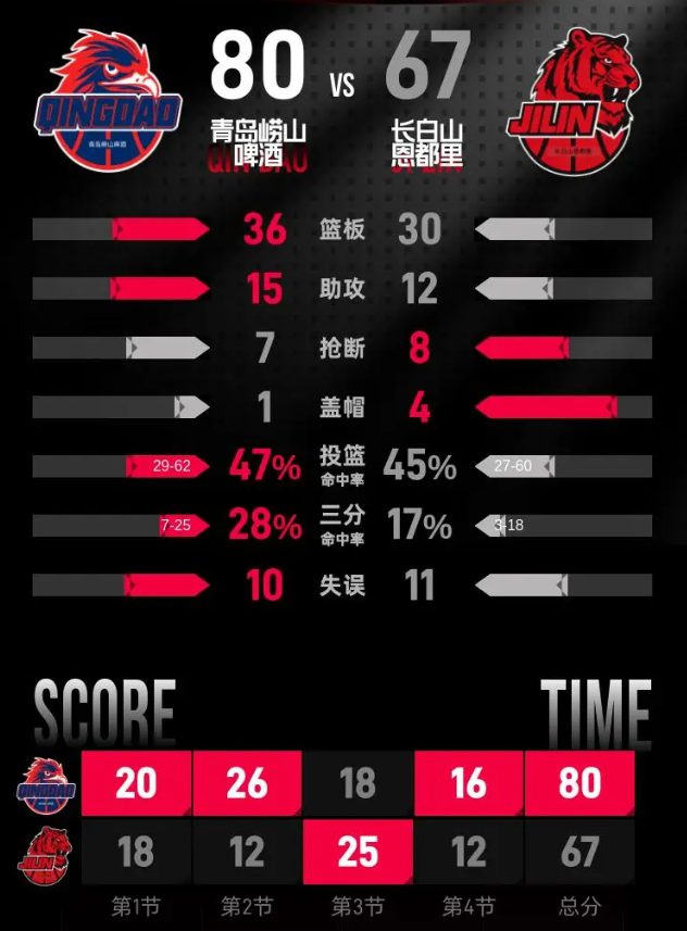 第四节,青岛崂山啤酒迅速调整状态,开局便打出一波19分的优势。尽管长白山恩都里在小节后段奋力追赶,但青岛队始终稳住领先地位,最终以一个较为舒适的分差结束比赛。比赛中,青岛崂山啤酒的乔丹·米奇表现突出,获得11分。第四节,青岛崂山啤酒以80-67赢得比赛胜利。