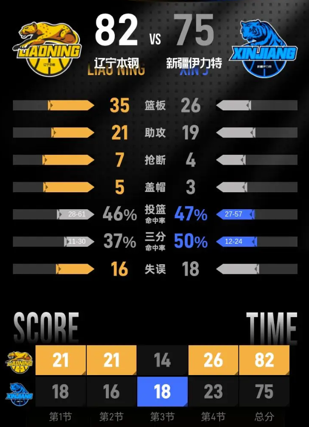 第四节,比赛进入白热化阶段,辽宁本钢和新疆伊力特的争夺依旧激烈。赵继伟在这一节中表现出色,贡献了13分,其中包括3记三分球。同时,新疆伊力特的伊力福拉提·莫合坦尔也不甘示弱,砍下16分,其中命中4记三分。最终,辽宁本钢以82-75赢得比赛。