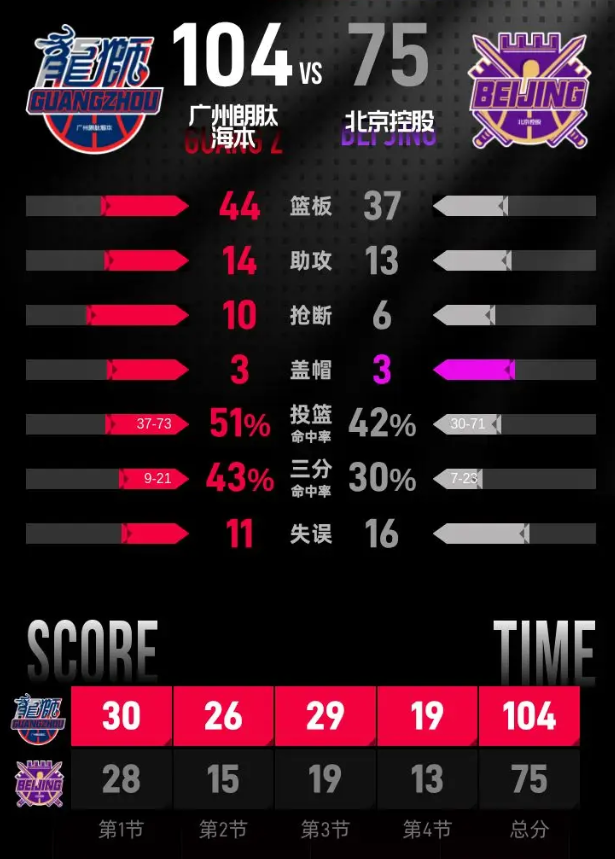 第四节,广州朗肽海本迅速进入状态,开局打出一波33分的攻势,显示出强大的进攻火力。在小节后段,北京控股虽然加大了进攻力度,但未能有效缩小分差。比赛进入末段,广州朗肽海本始终保持领先,最终以104-75赢得比赛。
