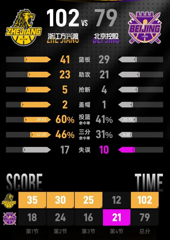第四节,北京控股进入状态不佳,曾一度落后38分。虽然在节中发起反击将分差缩小至23分,但浙江方兴渡的进攻依然保持高效。随后的时间里,浙江方兴渡稳扎稳打,保持着明显的优势。最终,浙江方兴渡以102-79战胜北京控股,赢得比赛胜利。