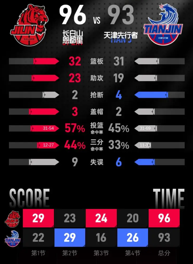第四节,天津先行者开局表现不佳,曾一度落后17分。尽管在节中阶段奋力反击,一度将分差缩小到2分,但长白山恩都里的进攻依然保持高效。在比赛进入最后阶段时,长白山恩都里的优势仍然明显。最终,天津先行者的大卫·詹姆斯在本节中得到13分,其中包括两记三分球。比赛最后,长白山恩都里以96-93赢得胜利。