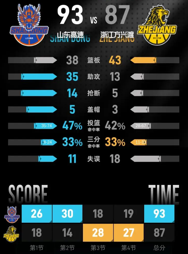 第四节,比赛进入胶着状态,双方竞争异常激烈。期间,浙江方兴渡的巴里·布朗表现抢眼,得到21分,其中5记三分球为球队注入了强心针。随着比赛的进行,山东高速最终以93-87赢得比赛,稳住胜利的局面。