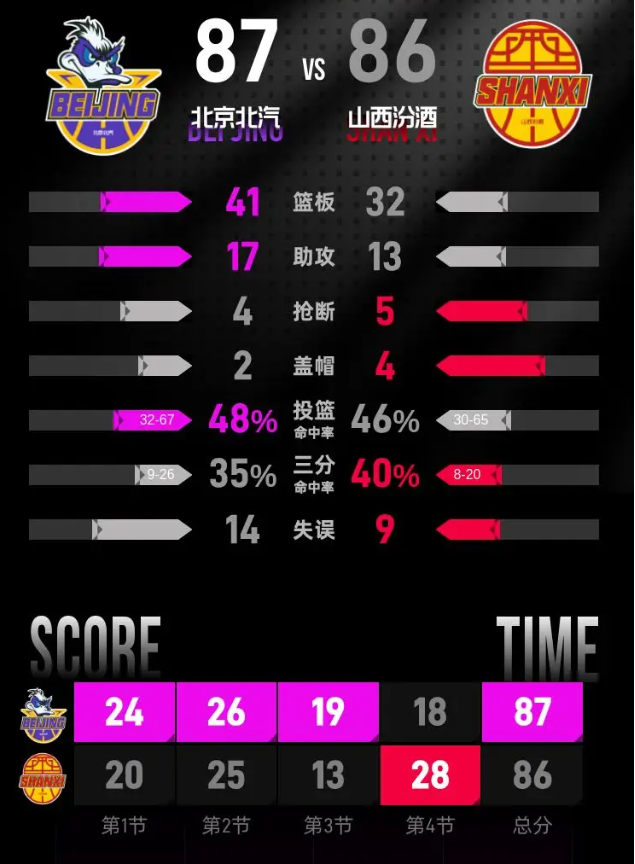 最后一节开始,山西汾酒逐渐找回状态,开始发力,不仅追平了比分,还实现反超,一度领先1分。临近比赛结束时,北京北汽成功止血,逐渐缩小分差。此节比赛中,山西汾酒的哈米杜·迪亚洛表现突出,攻下12分,其中包括1记关键三分球。最终,北京北汽以87-86赢得比赛。