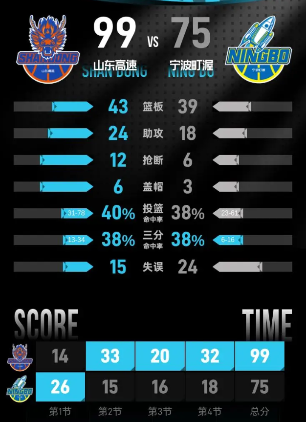 第四节,山东高速开局手感不佳,导致分差一度缩小至4分。然而,随着比赛深入,山东高速逐渐找回状态,强化进攻,打出一波24分的优势。尽管宁波町渥在小节后段奋力追分,但最终未能逆转。第四节,山东高速以99-75赢得比赛。