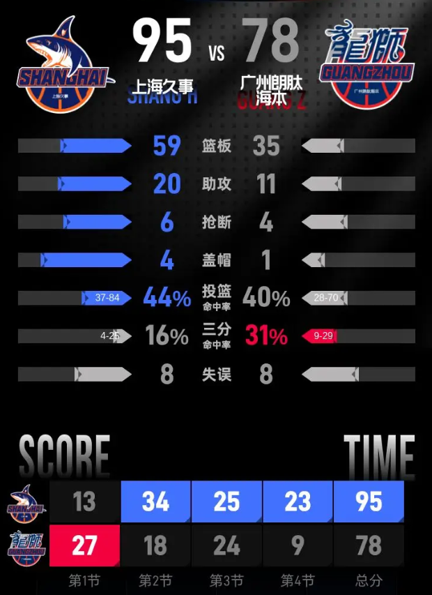 全场具体比分(上海久事队在后):27-13、18-34、24-25、9-23。