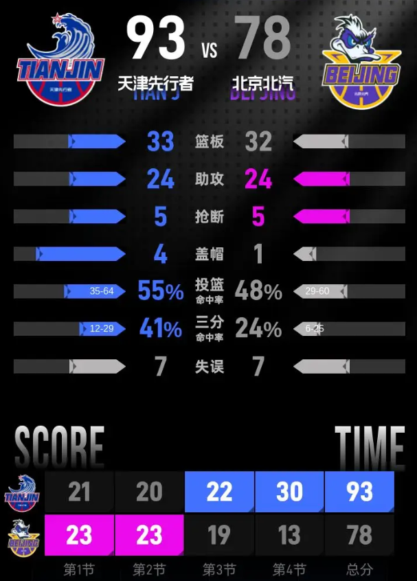 北京时间1月28日CBA常规赛第21轮,主场作战的天津先行者以93-78击败北京北汽。赖俊豪14分10篮板2助攻,赵睿13分3篮板5助攻。