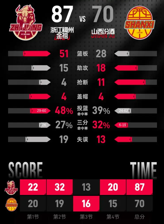 第四节,浙江稠州金租开局依然手感不佳,双方分差一度缩小至7分。可随着比赛的推进,浙江稠州金租重新找回状态,再次打出一波17分的攻势。在小节后段,山西汾酒虽奋起直追,但最终未能逆转比赛,浙江稠州金租以87-70赢得比赛。