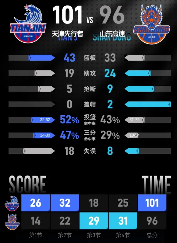 最后一节,天津先行者继续发力,开局便通过一波进攻将优势扩大至17分。节中,山东高速奋起直追,将分差缩小至2分。但在比赛后段,天津先行者再次找回状态,稳步保持优势,最终以101-96赢得比赛。林庭谦在这一节中再次发挥出色,贡献10分,其中包括2记三分球。
