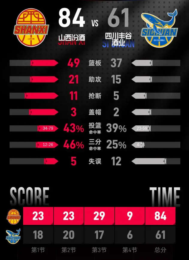 第四节,山西汾酒始终保持着领先优势,四川丰谷酒业未能找到有效应对之策,比赛已然进入尾声。最终,山西汾酒以84-61的比分赢得比赛。