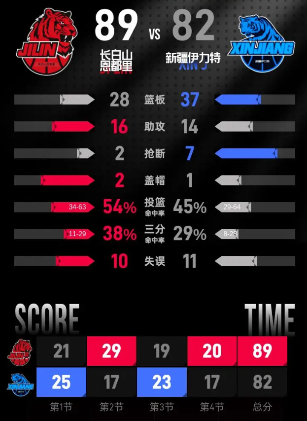 新疆伊力特队:扎卡里·纳托尔14分2篮板3助攻、阿不都沙拉木·阿不都热西提13分3篮板、戴德里克·劳森12分6篮板3助攻、杨芮10分1篮板、凯文·哈里斯10分1篮板1助攻、塞缪尔·门内加10分1篮板1助攻、伊力福拉提·莫合坦尔6分6篮板3助攻、冯傲4分1篮板、李炎哲3分2篮板、曲笑宇8篮板、葛浩然3助攻。