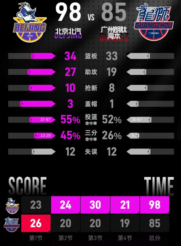 北京时间3月14日CBA常规赛第25轮,客场作战的北京北汽以98-85击败广州朗肽海本,北京北汽取得3连胜。陈盈骏13分5篮板13助攻,林德尔·威金顿24分2篮板6助攻。