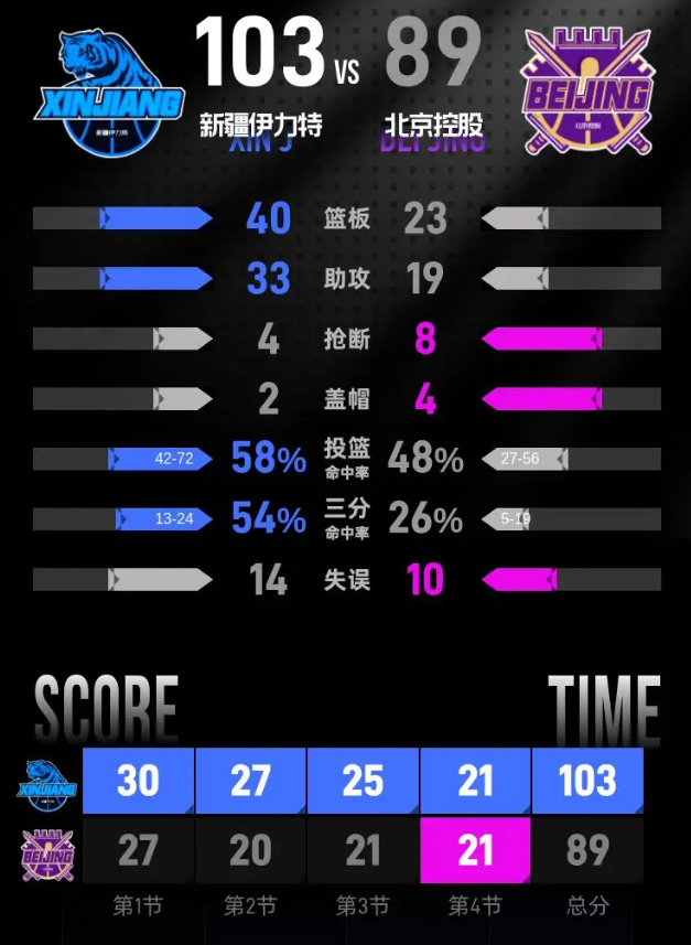 进入第四节比赛,豪斯开场投进三分,廖三宁抛投得分,北控将分差缩小到9分。伊力福拉提立刻回敬三分稳住局势,杨芮接连两记三分命中,分差重新回到14分。阿不都沙拉木、门内加接连得分,分差最大达到19分。廖三宁连续拿下4分,罗汉琛接助攻投进三分,北控将分差缩小到13分。阿不都沙拉木跳投三分后再抛投得分拉开分差,最后时刻豪斯罚中一分,全场比分定格为103-89。