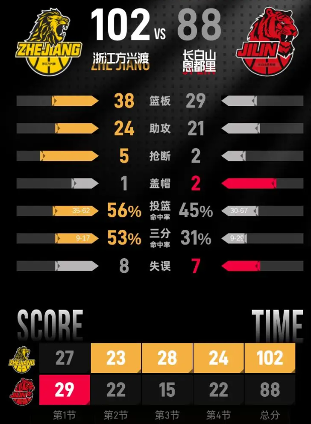 进入第四节比赛,塔克开场连拿4分,将分差扩大到15分。摩尔命中三分追分,胡金秋、林秉圣相继得分回敬,浙江始终保持两位数的领先优势。杨腾飞三分命中缩小分差,塔克连续罚中得分稳住局势,最后一分钟侯孟泽罚中一分,浙江确立15分领先优势。段立谦最后罚中一分,最终浙江主场以102-88击败长白山。